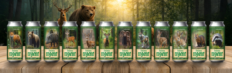 1. edice: Bohemia Regent Světlý ležák prémium 12° s 5 % alkoholu - Jezevec lesní, Medvěd hnědý, Zajíc polní, Jelen evropský, Daněk skvrnitý a Vlk obecný